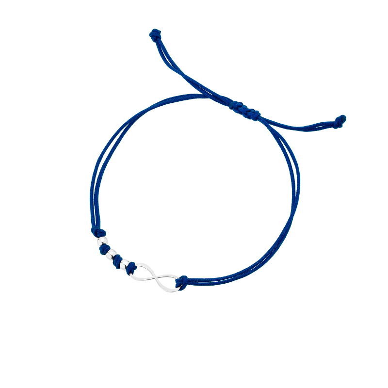 Bransoletka na granatowym sznurku ze znakiem nieskończoności. Element ozdobny został wykonany z rodowanego srebra próby 925. Trzy niewielkie, srebrne kulki dodatkowo zdobią formę bransoletki. Subtelny dodatek doskonale sprawdzi się jako uzupełnienie Twoich codziennych stylizacji. Bransoletka ma zapięcie typu makrama, zaciągane sznureczki pozwalają na idealne dopasowanie.
