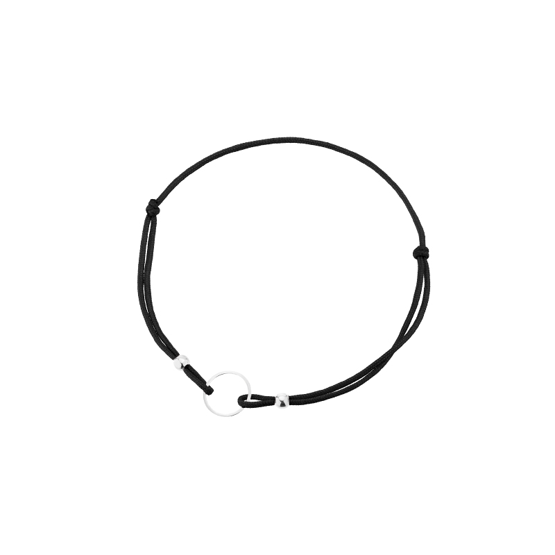 Bransoletka na czarnym sznurku z delikatnym ringiem. Całości dopełniają mieniące się, srebrne kulki dodające bransoletce niewątpliwego uroku. Element ozdobny został wykonany z rodowanego srebra próby 925. Proste motywy geometryczne to gorący trend tego, jak i nachodzących sezonów. Wygodne zapięcie z zaciąganych sznureczków pozwala na idealne dopasowanie do ręki.