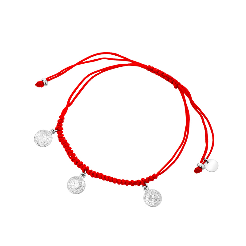 Bransoletka srebrna z monetami i czerwony sznurek