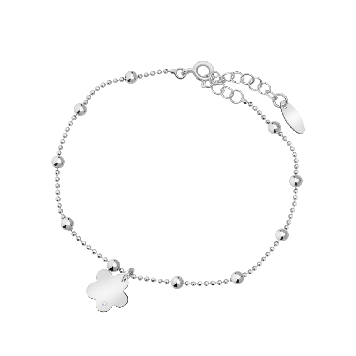 Bransoletka srebrna złożona z delikatnych srebrnych kuleczek. Całość zwieńczona zawieszką w kształcie kwiatu, który rozświetla delikatna cyrkonia. Propozycja, dla miłośniczek subtelnej, kobiecej biżuterii.