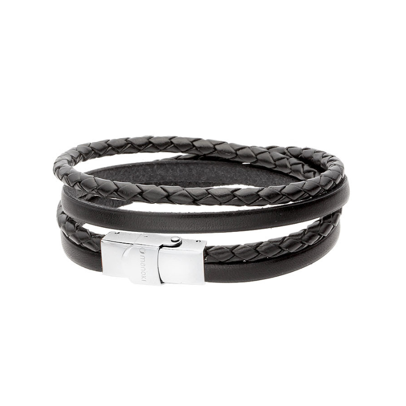 Bransoletka stalowa na czarnym skórzanym pasku