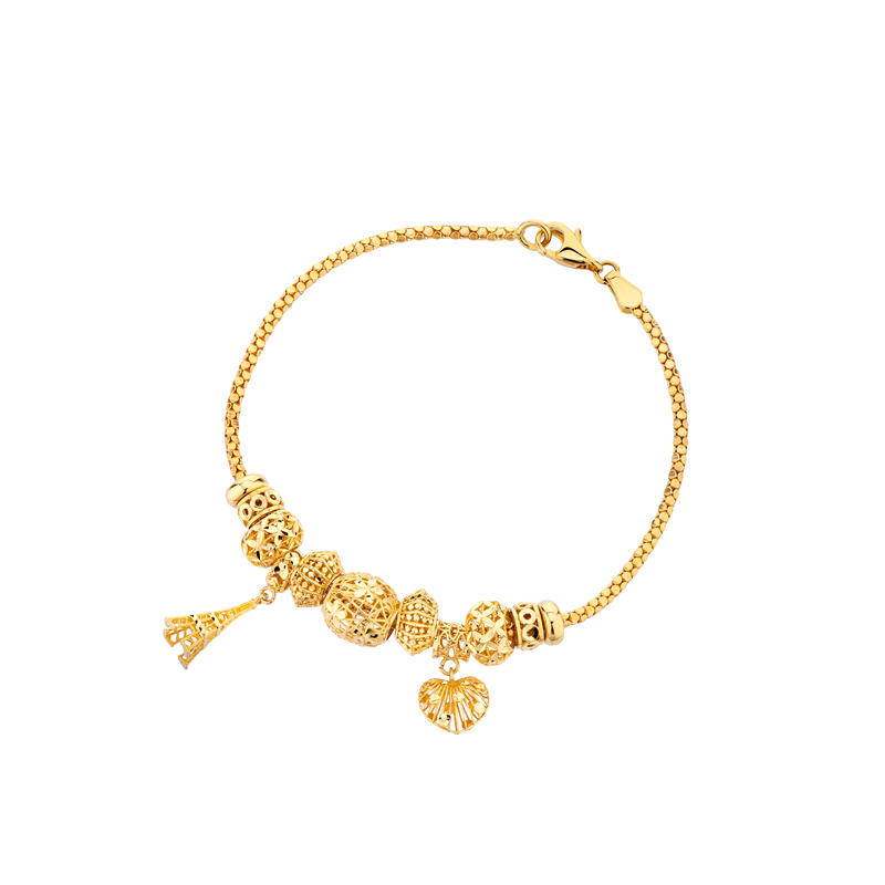 Bransoletka wykonana w próbie 585. Motyw błyszczących kulek oraz zawieszek w kształcie serca i wieży Eiffla jest romantycznym pomysłem na idealny prezent dla każdej miłośniczki oryginalnej biżuterii. Grubszy splot łańcuszka sprawia, że bransoletka jest widoczna na nadgarstku. Idealnie wkomponuje się w każdą stylizację. Posiada duże, wygodne zapięcie typu karabińczyk.