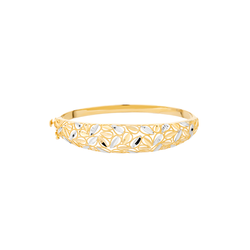 Sztywna bransoleta wykonana w złocie próby 585. Połączenie żółtego i białego złota. Bezpieczne zapięcie na zatrzask. Pomimo tego, iż ażurowy motyw roślinny nadaje bransolecie delikatności, nie traci ona na swoim okazałym wyglądzie. Bransoleta stanowi piękny prezent na każdą okazję.