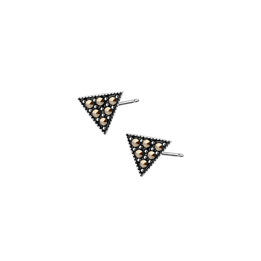 Niewielkie kolczyki w kształcie trójkątów z kolekcji Epoque Royale. Propozycja łącząca w sobie lśnienie srebra próby 925 z przyciągającą wzrok barwą markazytów. Biżuteria z kamieniami naturalnymi zauroczy kobiety lubiące subtelne ozdoby w nowoczesnym wydaniu.