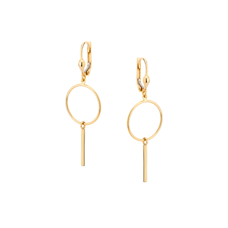 Minimalistyczne koczyki wykonane ze złota próby 333. Ponadczasowy motyw kół urozmaiciliśmy prostym, wiszącym elementem ozdobnym. Polerowana powierzchnia przepięknie odbija światło mieniąc się ciepłym blaskiem żółtego złota. Motywy geometryczne występują w wielu innych elementach biżuterii pozwalając na stworzenie unikatowych kompletów biżuterii. Kolczyki posiadają zapięcie typu lever back.