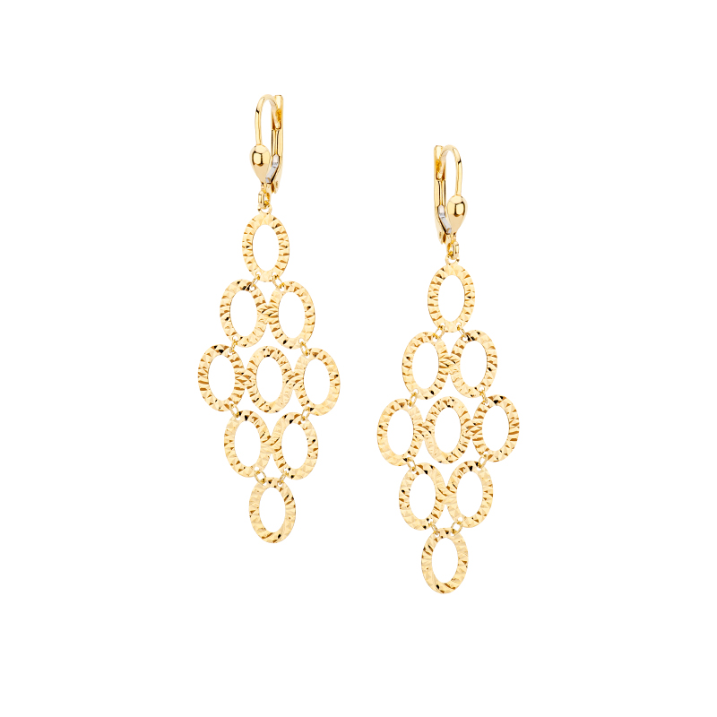 Ażurowe kolczyki wykonane ze złota próby 333, Misternie zdobione, diamentowane detale przepięknie odbijają światło podczas noszenia. Okazała forma koczyków doskonale sprawdzi się jako biżuteria uświetniająca wieczorowe kreacje. Wiszący element ozdobny podkreśla linię szyi i przyciąga spojrzenia. Kolczyki stworzą doskonały komplet z eleganckimi koliami. Elegancka biżuteria to idealny pomysł na wyjątkowy prezent – każda okazja jest dobra, by podarować bliskiej osobie zachwycający upominek. Kolczyki posiadają zapięcie typu lever back.
