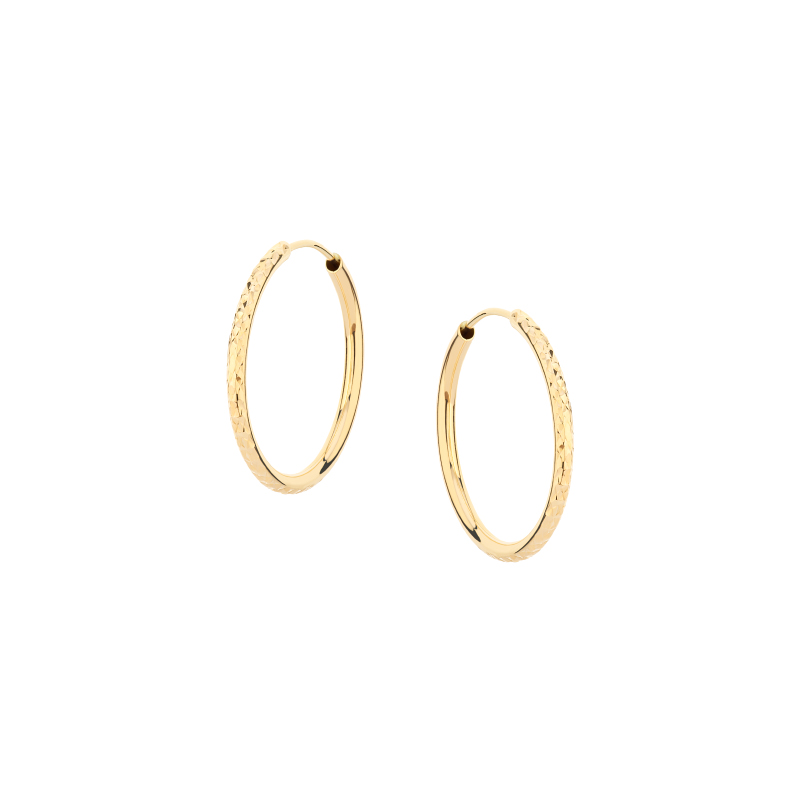 Klasyczne kolczyki koła wykonane zostały ze złota w próbie 585, żółty diamentowany kruszec oraz geometryczna forma sprawiają, że kolczyki świetnie sprawdzą się jako uzupełnienie codziennej stylizacji jak i również tych bardziej wieczorowych.
