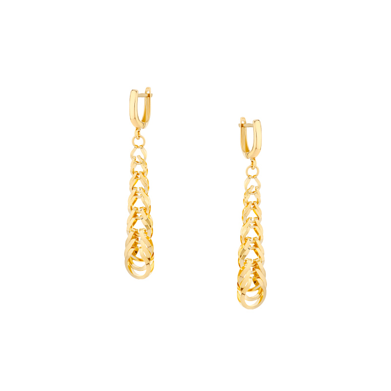 Piękne, wiszące kolczyki wykonane ze złota próby 585 z zapięciem angielskim. Łączone ze sobą lekkie ogniwka przepięknie mienią się w ruchu, migocząc niczym drogocenny klejnot. Ich wyjątkowy blask przyciąga spojrzenie a niepowtarzalna forma doda charakteru każdej Twojej stylizacji. Idealnie sprawdzą się jako dopełnienie wieczorowej kreacji. Kolczyki mogą stworzyć komplet, który dodatkowo składa się ze zjawiskowej kolii i bransoletki.