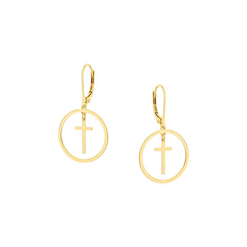 Proste kolczyki z motywem krzyża, otoczonym przez jedno, delikatne kółko. Wykonane z żółtego złota w próbie 333. Polerowane złoto sprawia, że kolczyki przepięknie lśnią podczas noszenia. Wygodne zapięcie typu lever back zapewnia komfort i niezawodność.