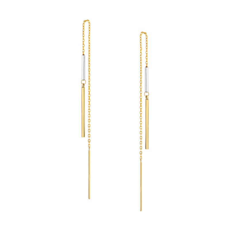 Minimalizm tego ponadczasowego, przewlekanego fasonu kolczyków urozmaiciliśmy połączeniem dwóch kolorów złota: żółtego i białego. Dzięki temu kolczyki doskonale komponują się z innymi elementami biżuterii. Subtelny, geometryczny kształt pozwala na tworzenie wyjątkowych kompletów z naszyjnikami i bransoletkami. Całość została wykonana ze złota próby 333.
