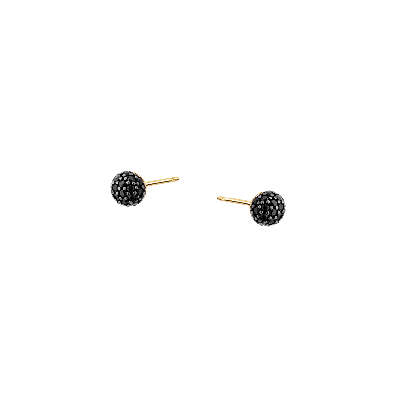 Ponadczasowe, złote kulki w oryginalnej, nowoczesnej odsłonie. Wykonane ze złota próby 585, zostały ozdobione mieniącymi się, czarnymi cyrkoniami. Kolczyki posiadają wygodne zapięcia typu sztyft.