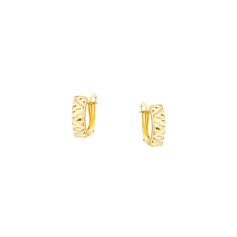 Złote kolczyki wykonane z kruszcu w próbie 333. Prosta, nieprzemijająca forma została ozdobiona wyjątkowym diamentowaniem. Dzięki niemu kolczyki lśnią i migoczą podczas noszenia. Doskonale sprawdzą się jako element biżuterii noszonej na co dzień i idealnie dopełnią wieczorowe stylizacje. Kolczyki posiadają wygodne zapięcia angielskie.