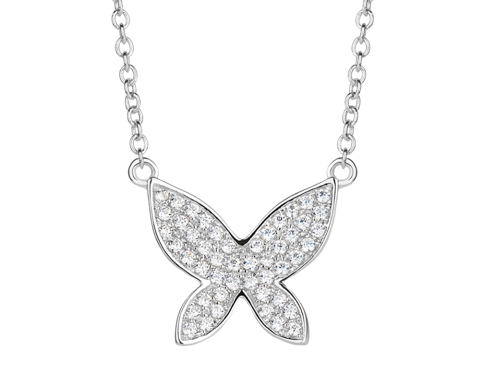 Urokliwy naszyjnik wykonany ze srebra próby 925 w kształcie motyla. Delikatny łańcuszek zwieńczony zawieszka ozdobioną mieniącymi się cyrkoniami. Lekki, filigranowy naszyjnik doda niewymuszonej elegancji i dziewczęcego wdzięku.