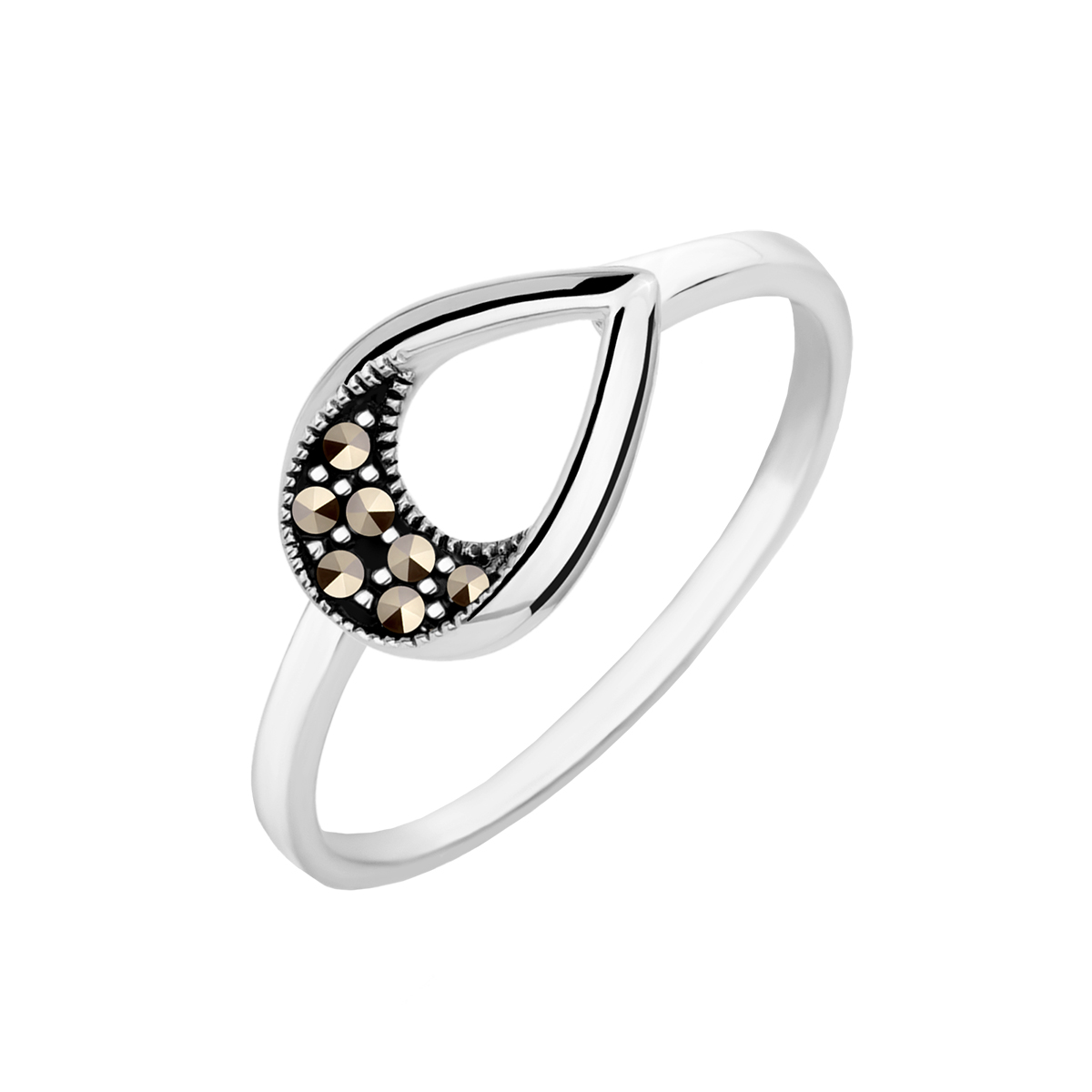 Pierścionek wykonany ze srebra próby 925 z kolekcji Epoque Royale. Zjawiskowy dodatek łączący tradycyjne wzornictwo z nowoczesną formą. Asymetrczyny kształt o delikatnych liniach ozdobiony mieniącymi się kamieniami o wielkiej mocy- markazytami. Biżuteria, która zachwyci miłośniczki nietuznikowych dodatków.