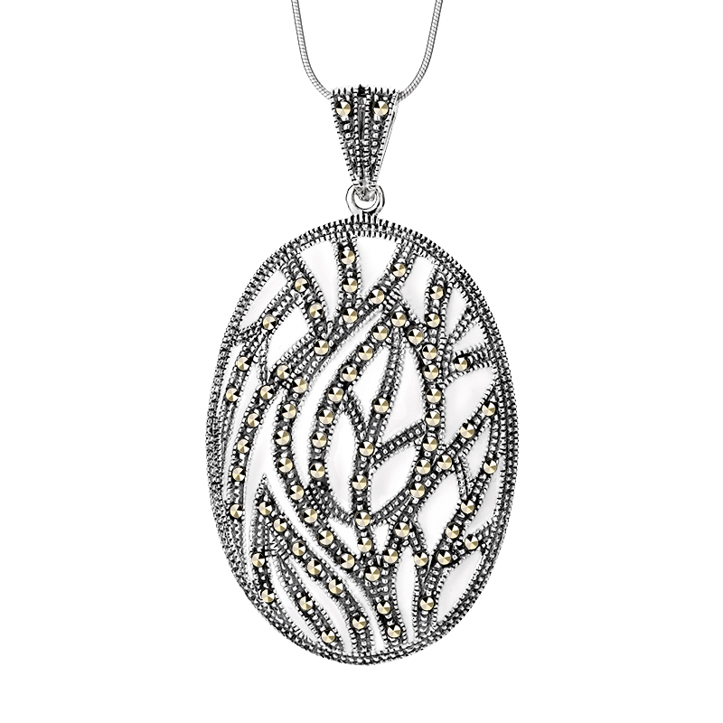 Propozycja od kolekcji Epoque Royale w stylu retro. Zachwycająca zawieszka z ornamentem roślinnym wysadzanym markazytami. Biała emalią i połyskujące kamienie dodaje finezji wyrazistej biżuterii. Zawieszka została wykonana ze srebra próby 925.