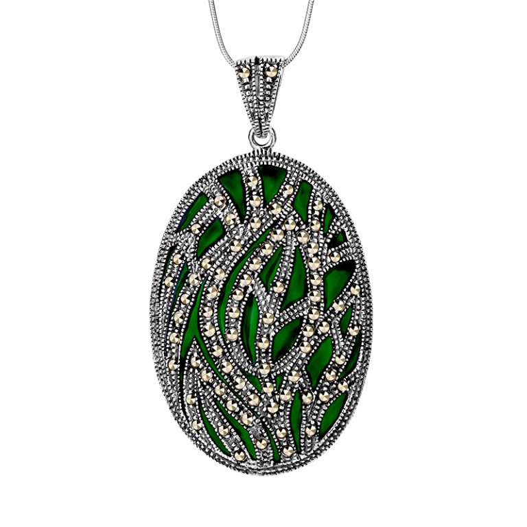 Markazyty-kamienie, które zachwycaj subtelnym blaskiem, ozdobiły srebrą zawieszkę próby 925. Zjawiskowy, roślinny ornamnet podkreślony głębią zielonej emalii. Biżuteria w stylu retro od kolekcji Epoque Royale.