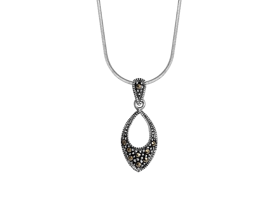Zawieszka w stylu retro od kolekcji Epoque Royale. Efektowna forma, została ozdobiona markazytami tworząc niezwykle elegancki dodatek. Zawieszka została wykonana ze srebra próby 925.