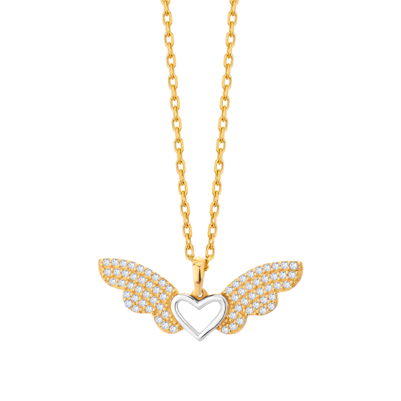 Złota zawieszka wykonana z kruszcu próby 333. Serce wykonane z białego złota ozdobiliśmy parą złotych skrzydeł. Okraszone rzędami niewielkich, połyskujących cyrkonii przepięknie mienią się podczas noszenia. Połączenie żółtego i białego kruszcu pozwala na tworzenie wyjątkowych kompletów wraz z innymi elementami biżuterii. Zawieszka doskonale prezentuje się zarówno na łańcuszkach o grubszym jak i tych o delikatniejszym splocie.