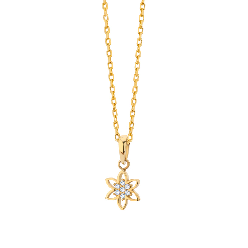 Niewielka, złota zawieszka wykonana z kruszcu próby 333. Subtelna forma sprawia, że doskonale sprawdzi się jako biżuteria noszona na co dzień. Białe cyrkonie wykorzystane do wypełnienia ażurowego kwiatka mienią się podczas noszenia. Ich chłodny blask doskonale kontrastuje z ciepłym kolorem szlachetnego kruszcu.