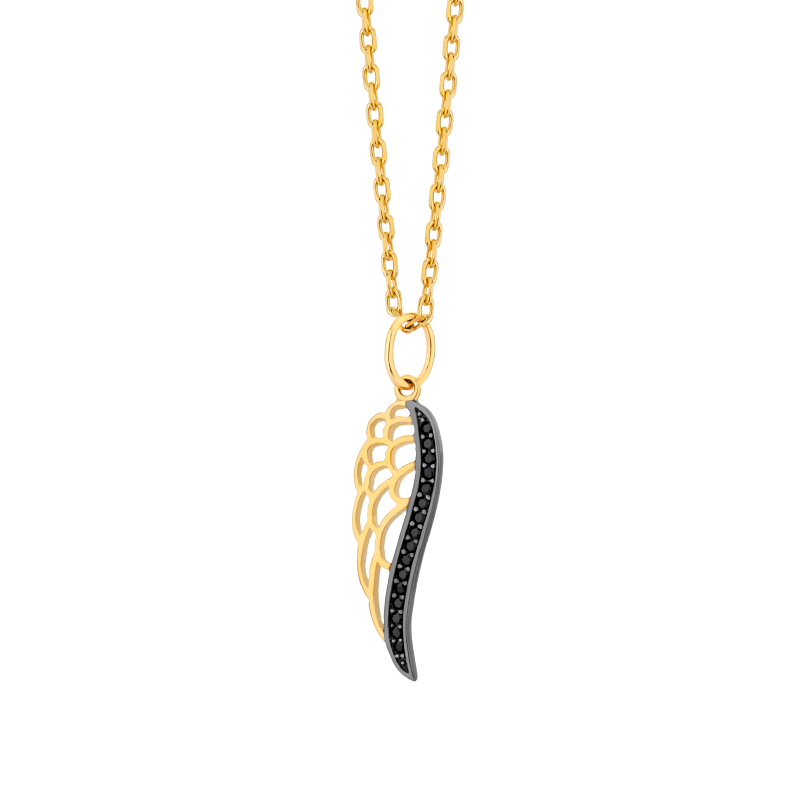 Delikatna złota zawieszka próby 585 z dodatkiem czarnej cyrkonii. Ażurowy motyw skrzydła to jeden z najczęściej wybieranych wzorów. Oryginalny dodatek, który wpasuje się w każdą stylizację. Stanowi także doskonały prezent na każdą okazję.