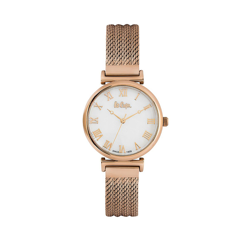 Damski zegarek Lee Cooper w kolorze różowego złota. Czasomierz posiada bransoletę typu mesh z możliwością regulacji długości. Tarcza wykonana została z jasnej masy perłowej, dzięki czemu delikatnie mieni się w promieniach światła. Posiada mechanizm kwarcowy, zasilany na baterię. Na zegarek udzielana jest dwuletnia gwarancja producenta.