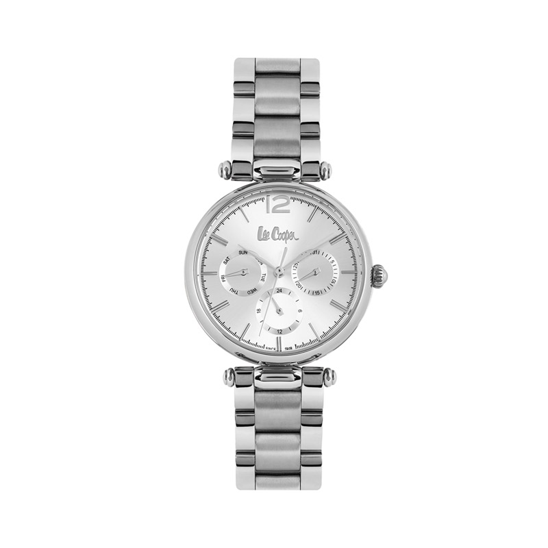 Damski zegarek Lee Cooper w kolorze srebrnym na bransolecie z matowych i błyszczących ogniw. Na szarej tarczy o metalicznym połysku znajduje się rozbudowany datownik. Zegarek posiada szkiełko mineralne. W zegarku wykorzystano niezawodny mechanizm kwarcowy. Posiada on wodoszczelność 3ATM, co oznacza odporność na delikatne zachlapania, np. przy myciu rąk. Na zegarek udzielana jest dwuletnia gwarancja producenta.
