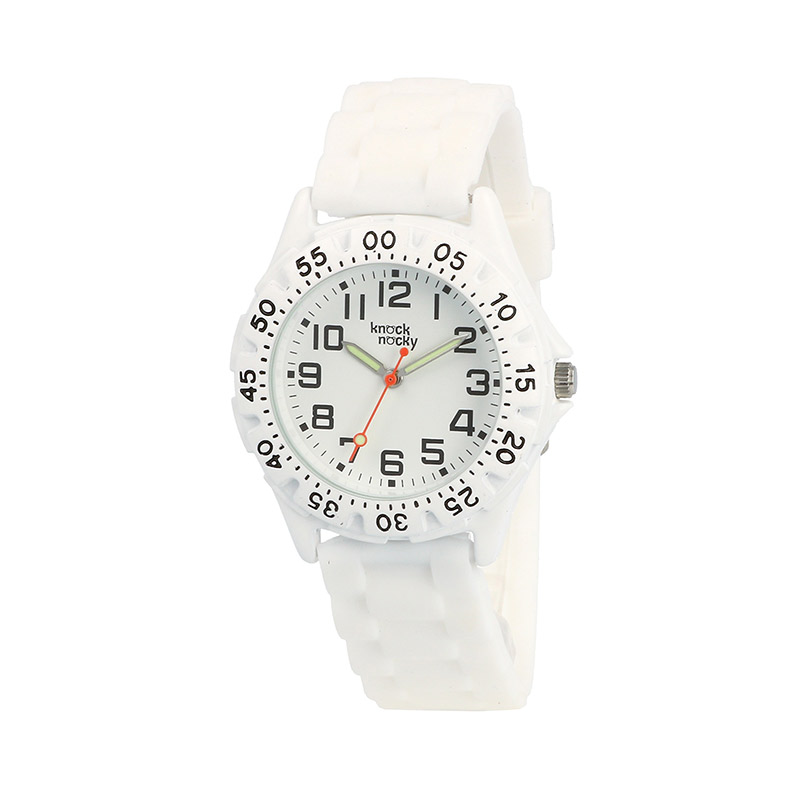 Dziecięcy zegarek Knock Nocky w kolorze białym. Elastyczny pasek z tworzywa posiada szeroką możliwość regulacji długości. Czytelna tarcza koloru białego z czarnymi indeksami. Wskazówki zostały pokryte powłoką Neobrite, co sprawia, że będą widoczne w ciemnych pomieszczeniach lub wieczorem. Zegarek wyposażony jest w niezawodny zegarek kwarcowy, zasilany na baterie. Wodoszczelność na poziomie 30 metrów sprawia, że zegarek jest odporny na delikatne zachlapania i wilgoć. Posiada dwuletnią gwarancję producenta.